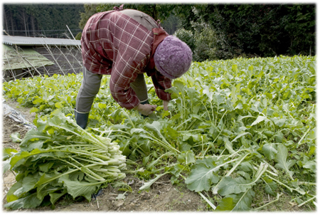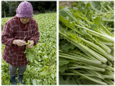 強い寒波が去り、寒さが緩いだ12月の末、日に数本のバスに揺られ高山を訪ねました。お話をしてくださったのは代々の高山真菜 栽培農家 中道 照代さん。この日は10キロ程の注文があり、冬日に青々と輝く真菜を一株一株、丁寧に摘み取って行きます。府の専門家の指導のもと、エコ農法にも取り組み、一人でも多くの人に美味しい真菜を食べてほしいとおっしゃいます。昨今の食事情、中でも野菜に関しての消費者の認識を嘆き、生産者の高齢化や地域の過疎化も憂いながら、やっぱり安全で美味しい野菜をつくりたいと笑っていました。