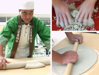 地産地消を応援するイベントコーナーで、組合員の方が蕎麦打ち実演と試食、販売をされていました。実演の方は連日のイベントのため、朝から夕方まで何回となく打たれるため、腰が痛いと言いながら汗だくでモクモクと作業を続けておられました。