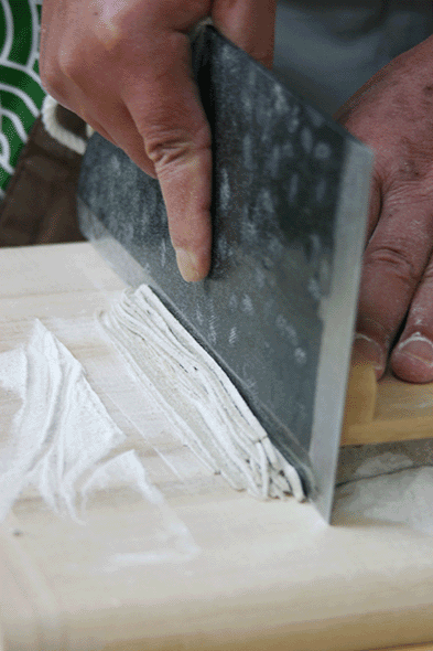 今回収穫された蕎麦は選別され、石臼ですり潰されます。できあがったそば粉は、全麺協主催の初段資格の方7名の手により、順次手打ちされて商品になります。栽培品種は特に腰が強く、二八蕎麦でも打つのに大変らしいです。現在道の駅での販売の他ソバ打ち体験教室、組合主催や各地でのイベントへの参加等でしか手に入れられません。
