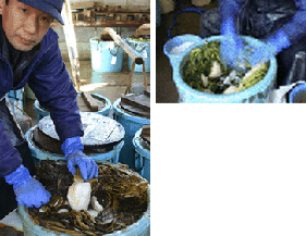 溝川さんは一つ一つの作業を見せて下さった。すぐきの漬け込みは、まず皮をむき水洗いをした後、塩水に浸して荒漬けをする。その後、樽の中に本漬けしてゆく。最終行程として40℃前後の室に入れ発酵させる。その日はすでに本漬けの準備に入っていて、慣れた手付きで樽にすぐきを渦巻き状に並べ、塩をふる。塩の量は決まっているわけではなく、その都度見合った量を見極め加減するそうだ。長年の経験がものをいう。