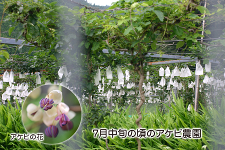 アケビには5種類あるそうですが、当農園では葉が3枚のミツバアケビと葉が5枚のゴヨウアケビが無農薬栽培されています。調べてみますと、アケビは「自家不和合性」で、他系統の2種類以上を栽培することにより良質のアケビができるそうです。