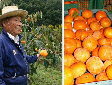 柿が店頭に出だすのは、10月終わり頃にかけて「しぶ柿系」刀根早生にはじまり、10月中旬から平核無柿(ひらたねなしがき)と続き、それを追いかけるように「甘柿系」の富有柿が出てきます。他に庄内柿、愛宕柿、筆柿など沢山のなじみの柿が全国の店頭を賑わします。