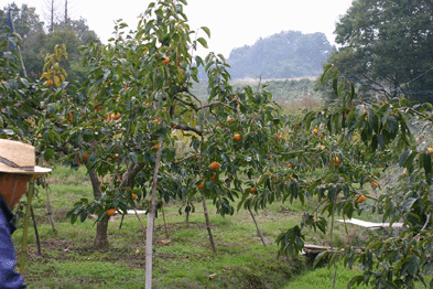 当地区でも10年ほど前から「すなみ柿」作りが普及してきたそうです。最初の頃、山崎さんの柿園は、水が多い場所で排水に相当苦慮されたそうです。苦労の結果排水がうまくいき、柿栽培には最良の状況になっているらしいです。13aの柿園には現在約25本の栽培木、毎年平均500kgを出荷されています。