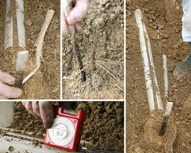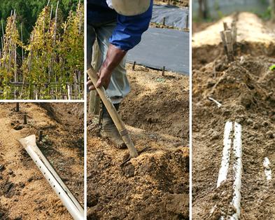 目印の部分には芋の先が顔を出し、種芋はこの状態で植え付けてあったんです。色々な栽培法があるようで、「この栽培法では、パイプは15度位の角度で埋まっています。」