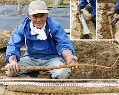 掘ってみな、わからんのやけど・・・パイプが掘り出され、いよいよ「自然薯」とのご対面。パイプをひっくり返し、土を丁寧に取り除くと、出てきました。自然ものみたいにクネクネしてはいませんが、日頃食べ付けているナガイモとは違い、芋の色が濃いように思えます。測っていただくと、1m60cmあるりっぱな「自然薯」。「ええ芋や」思わずにっこり。