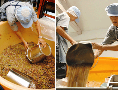 朝、伺いますと作業着に前掛けといういでたち。まさに社長自ら陣頭指揮で引っ張る活気のある醸造所です。さっそく工場へ、ぶどうの搾りを見学。前の日にスキンコンタクト(破砕した皮と実を同一タンクで低温熟成)された甲州種(カタシモ本ぶどう)を、手作業で手際よく搾り機に移して行きます。