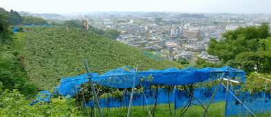 見る間に下の大きなトレイに滴り落ちます。このジュースはもう一度冷蔵庫で寝かせます。農園を案内して頂けるという事で一旦、工場をはなれぶどう畑のある合名山に移動です。数分の移動で河内平野を一望するなだらかな山腹の農園に着きます。この辺りの山は、南に向いて傾斜し日照時間が長く、明治の初期に国策によるぶどうの導入がなされた時からぶどう栽培に適した土壌だったとのこと。その上、当時の農家の人々の努力による技術の向上も手伝って、昭和の初めには生産量日本一を誇っていたそうです。ぶどう畑には収穫を待つばかりのぶどうがたわわに実っています。