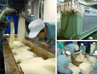この日は酒槽(ふね)を使ったものと通称ヤブタと呼ばれる自動圧搾機を使う方法との二通りを見せていただきました。酒槽(ふね)を使う作業は、もろみ(お酒を搾る前、まだ溶けた米が混じったもの)を袋に詰め1つ1つ丁寧に内側に積み重ねて行くのですが、身体を二つに折っての上下の移動はいかにもきつそうです。