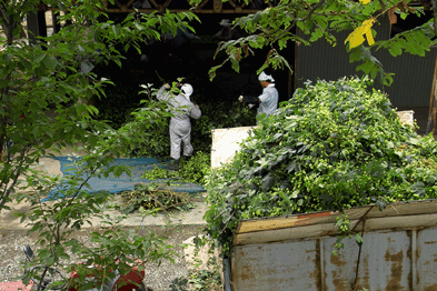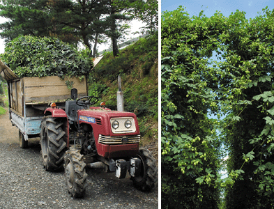 ピークを迎えた8月下旬は、毎日、午前3時には身の丈の数倍にもなるホップの収穫を始めます。大きなコンテナにギュウギュウ、しかも山盛りに刈り取った蔓を作業場に運びます。早朝の刈り取りは、濱田さん、奥さんともう一人手伝いの男性との3人です。作業場には5、6人の手伝いさんがそれぞれの持ち場で待ち受けます。