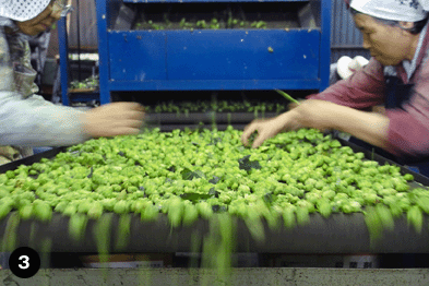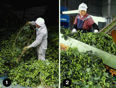 ベルトコンベアで毬花と枝ツルを分ける機械へ送ります。