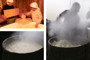 今日は二次仕込みの掛け米、小一時間ほどで香ばしいにおいとともに蒸し上がる。ご主人と息子さんの息もピタリと放冷作業に移り、適度にさめた蒸米を奥様明美さんの待つカメに運びつぎつぎに投入。アッと言う間のことのように思われた。この作業を二回。