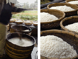 まずは洗米、木製の半切り桶の中にヒノヒカリ、昔ながらの手作業でみごとに手際よくいかきにあげられ水切り台に並ぶ。向かいの畑と白い米のコントラストが気持ちよい。