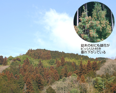 今年の花粉飛散量は西高東低とか、例年になく温かい日が多くて、天気予報の花粉前線は2月中旬から始まっています。徳島の田舎育ちの私は、子供自分には杉の実を弾に使い、竹で作った『杉鉄砲』で遊んだものです。私の住む三重県も周囲の山々の杉が紅葉しているみたいです。