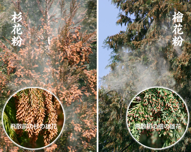 花粉症を引き起こす風媒花(風の力で花粉を飛ばすタイプ)は、現在日本では50種類以上確認されています。一般的に樹木では春が中心では2月から4月はスギ、3月から5月はヒノキ、イネ科の場合は初夏に、キク科(ブタクサ、ヨモギなど)の場合は7月から10月に飛散します。
