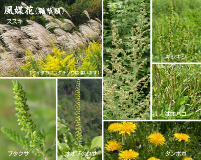 雑草類ではブタクサ、ヨモギ、タンポポ、イラクサ、オオバコ、ギシギシ、スイバ、カナムグラなど(セイタカアワダチソウは違います)