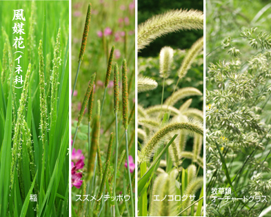 イネ科では水稲、ススキ、カモガヤ、スズメノテッポウ、アシ、牧草類など