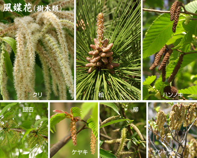 樹木では杉、檜、白樺、松、銀杏、ハンノキ、コナラ、クヌギ、ケヤキ、樫など