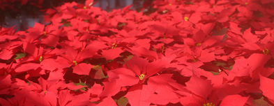 めっきり冬めいてきた12月1日、三重県伊賀市大山田、ガラス温室が並ぶ大山田村洋蘭組合の前川園芸さんを訪ねました。大きなガラス温室の中は暖かで、洋蘭をはじめクリスマス定番の「ポインセチア」3500鉢の出荷作業が続けられています。4合鉢で育てられた「ポインセチア」は緑の葉に色鮮やかな赤が映え、一面が赤色の絨毯。