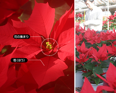 赤い部分は花ではなく、葉ポインセチアはメキシコ西部原産ですが、最近では品種改良が進み赤以外にも薄緑色や紫、ピンク、青、黄白などたくさんの新しい品種が次々と登場しているみたいです。勘違いされる方が多いと思いますが、花のようにみえる赤い部分は、ガクが変化した苞(ほう)と呼ばれるものです。花はその中央の黄色い部分。鉢を購入する時はこの花が落ちていないものを選ばれると良いそうです。。