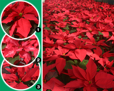 やはり、赤色がイチバンの人気赤と緑のクリスマスカラーがポピュラーで、人気が高いみたいです。当園では、イチバン、アイスパンチ、ジェスターレッド、エンデュアリング・レッドの4品種を栽培。当日は下記の3品種(人気順)が出荷最盛期でした。
