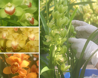 シンビジュームも出荷のピーク違う温室内では、シンビジュームも出荷作業に追われていました。緑、黄、オレンジ、白など色々な花色があり、こちらの蘭もポインセチアの真っ赤とは違う美しさ。コントラストのはっきりした「ポインセチア」と優雅な「シンビジューム」。両極端の季節の花を楽しませていただきました。