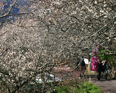 私も毎年梅見に訪れていますが、ダム湖周辺の梅を眺めながら茶店や売店の並ぶ山上の梅林を目指します。