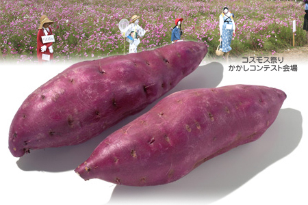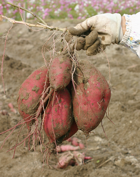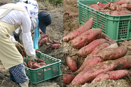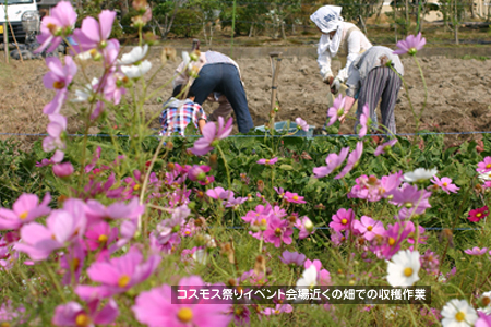 コスモスの里で知られるようになった三重県伊賀市比自岐、毎年恒例のコスモス祭りが先週末開催され観光客も多数訪れ、今年も盛況でした。イベント会場近くのサツマイモ畑で「鳴門金時」を収穫されている「笑みの市」のメンバーの方達にお話を伺いました。