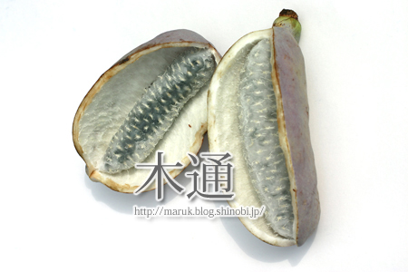アケビ(木通、通草)は、アケビ科アケビ属の蔓性落葉低木で、最近は知らない方が増えたかと思いますが、里山の秋の実りとして紅紫色に熟したゼリー状の果肉はとても甘く、生食できます。また新芽は山菜として、果皮は炒め物や揚げ物、煮物等の料理にも使われます。木質化した蔓は木通=もくつうと呼ばれ、生薬として利尿やむくみ生理痛などに利用されます。