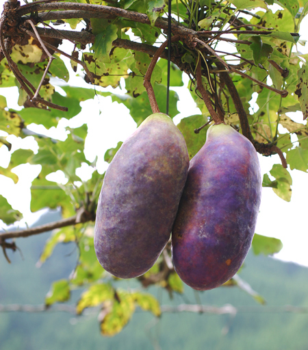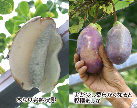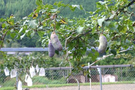 アケビには5種類あるそうですが、当農園では葉が3枚のミツバアケビと葉が5枚のゴヨウアケビが無農薬栽培されています。調べてみますと、アケビは「自家不和合性」で、他系統の2種類以上を栽培することにより良質のアケビができるそうです。