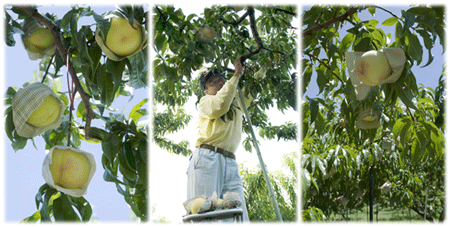 デパートやくだもの屋の店頭には今、各地の桃が所狭しと並べられています。長い梅雨の晴れ間をえて、和歌山県紀の川市桃山町に、名産の