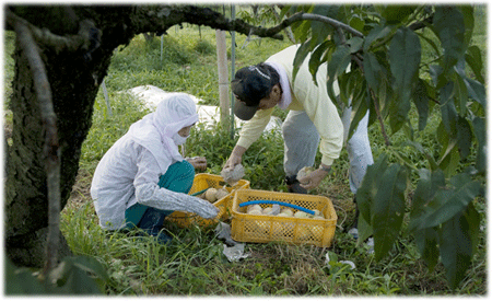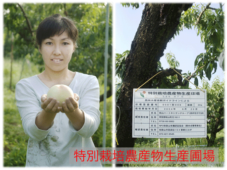 桃の木は、3年以降10年ほどで収穫に至り、30年を過ぎると衰えるそうで、藪本さんの所でも3年前に若木を植えて有りました。今の農園は、ご主人とあずささんのそれぞれのお爺さまが、一代で作り上げたもので、お二人は今後、専業を目指して少しずつ大きくしていきたいとか。後継者難や放置農園など、様々な問題をかかえながらも頑張る農家のモデルケースになれればと、キトサン使用の減農薬栽培、特別栽培農産物生産圃場の認定など、安全な食物の生産に関わる農家として近い将来、無施肥無農薬の桃の提供を目標に頑張っていらっしゃいます。