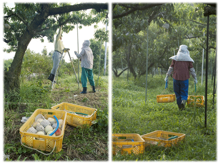 白鳳(はくほう)の収穫を終えて、7月末あたりまでが最盛期になります。前日までにかなりの収穫があったとの事で、この日は比較的のんびりムード。脚立の上で収穫されるお父様の ちかひろ さんにお話しを伺いながら合間にシャッターをカチャッ。収穫用のコンテナ20個ほどでこの日は終了です。その後は、自宅直売所に持ち帰り選別に入ります。